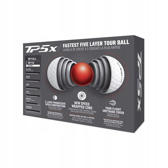 Piłki TaylorMade TP5x 2024 to najwyższy model w ofercie TaylorMade, zaprojektowany z myślą o pełnej wydajności od początku do końca rundy golfowej. Dzięki opatentowanej pięciowarstwowej konstrukcji, piłki zapewniają wysoką prędkość, świetne czucie oraz doskonałą dynamikę. TP5x to najlepsza piłka w ofercie tej marki, ciesząca się popularnością zarówno wśród zawodowców, jak i amatorów.